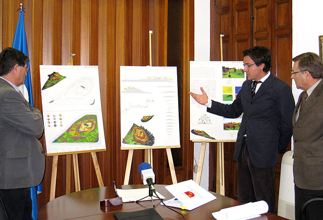Foto: El alcalde de Águilas, Juan Ramírez, el redactor del proyecto, Miguel San Millán, y el director general de Vivienda y Arquitectura, Marcos Nogueroles, mostrando el proyecto 'Artifauna', uno de cuyos objetivos es la recuperación de las especies animales de la zona.