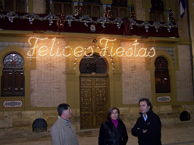 El acalde de Águilas, Juan Ramírez, la edil de Festejos, Clara Valverde y el concejal de Deportes, Francisco Hernández, han llevado a cabo, esta misma noche, el encendido oficial de la iluminación navideña del municipio.