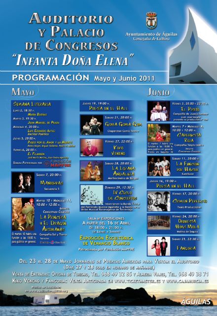 Hoy lunes, 9 de mayo, en el ayuntamiento de Águilas, la edil de Cultura, Turismo y Festejos, Clara Valverde y el gerente del Auditorio y Palacio de Congresos "Infanta Doña Elena", Antonio Llamas, han presentado en rueda de prensa el programa de actos que se llevará a cabo durante los meses de mayo y junio de 2011.