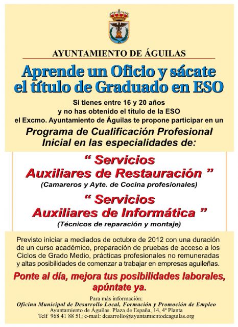 El Ayuntamiento de Águilas, a través de la concejalía de Desarrollo Local, Comercio, Industria y Empleo, está organizando un Programa de Cualificación Profesional Inicial, en las especialidades de Servicios Auxiliares de Restauración (camareros y ayudantes de cocina) y Servicios Auxiliares de Informática (técnicos de reparación y montaje).