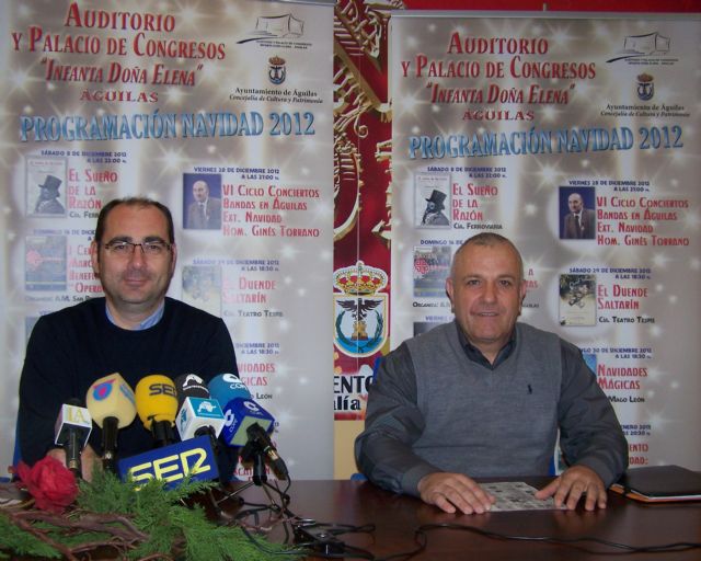 Los espectáculos detallados por Francisco Miguel Martínez han sido los siguientes: representación teatral de la obra "El sueño de la razón", de Antonio Buero Vallejo, a cargo de la compañía Ferroviaria (8 de diciembre, 22'00 horas. Precio de la entrada 12 €); Certamen de marchas procesionales a beneficio de Cáritas, con la participación de 6 bandas procedentes de las provincias de Murcia y Almería, entre las que se encuentra la agrupación musical San Pedro Apóstol de Águilas, organizadora del acto (16 de diciembre, 17'30 horas. La entrada será gratuita, en su lugar se entregarán alimentos destinados a la "Operación Kilo"); Espectáculo de humor "Historias Mías", a cargo del ex-componente del dúo Cruz y Raya "Juan Muñoz" (21 de diciembre, 22'00 horas. Precio de la entrada 9 euros anticipada o 12 en taquilla); Concierto extraordinario de navidad para niños y familias, bajo la dirección de Isabel Rubio, organizado en colaboración con la asociación Promúsica Águilas, en el que se interpretará "La sinfonía de los juguetes" de Haydn y la obra "Pedro y el Lobo" de Sergei Proko?ev, acompañada de un narrador y actores (22 de diciembre, 17'00 horas); Encuentro de cuadrillas, organizado en colaboración con la cuadrilla de "Marina de Cope", que actuará junto a las de "Cuesta de Gos" y "Pasiones Huertanas" (22 de diciembre, 22'00 horas. Entrada gratuita, hasta completar aforo); Musical "Camino de la felicidad", a cargo de la escuela de baile Nuevo Ritmo (26 de diciembre, 21'00 horas. Precio de la entrada 5 euros); Concierto extraordinario de Navidad, homenaje a Ginés Torrano, a cargo de la banda del Patronato Musical Aguileño (28 de diciembre, 21'00 horas. Entrada gratuita, hasta completar aforo); representación teatral de la obra "El duende saltarín", a cargo de la compañía Tespis (29 de diciembre, 18'30 horas. Precio de la entrada 7 euros adultos y 5 euros los niños); Espectáculo de magia con "Enrique de León" (30 de diciembre, 18'30 horas); XIX Cuento de Navidad, bajo el título "Rescate en el Mundo de la Fantasía", a cargo de la compañía Marco Blanco (3 de enero, 20'30 horas. Precio de la entrada 5 euros); Concierto de Año Nuevo con la Orquesta Sinfónica "Ciudad de Elche", organizado en colaboración con la asociación Promúsica Águilas (4 de enero, 20'45 horas).