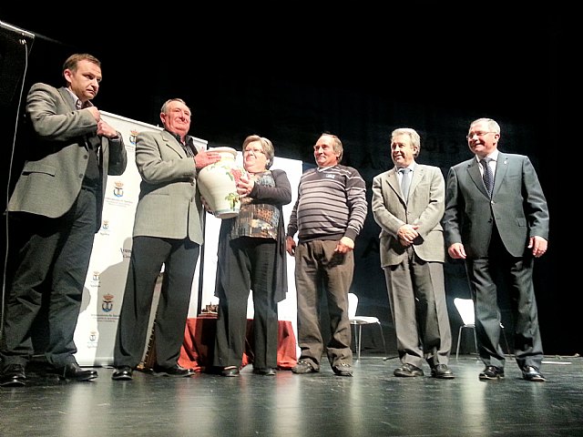El consejero de Agricultura y Agua, Antonio Cerdá, junto con el alcalde de Águilas, Bartolomé Hernández, y el presidente de Asaja, Alfonso Gálvez, entregó anoche el premio al 'Agricultor del Año' a la explotación familiar de Pedro Asensio y María Ascensión Hernández, con motivo de los actos que durante este fin de semana celebra la Asociación de Agricultores del municipio.
