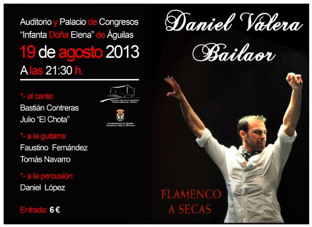 A las 21:30 horas, la compañía del conocido bailaor aguileño, Daniel Valera, presentará su último espectáculo "Flamenco a secas", en el que participarán los cantaores Bastían Contreras y Julio "El Chota", acompañados por la percusión de Daniel López y las guitarras de Faustino Fernández y Tomás Navarro.