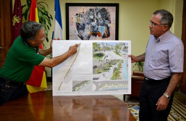 El alcalde de Águilas, Bartolomé Hernández, y el concejal de Bienes y Obras, Diego Martínez, presentaron esta mañana el proyecto de construcción de un "cinturón verde" para la ciudad, que estará dotado de paseo peatonal y carril bici.