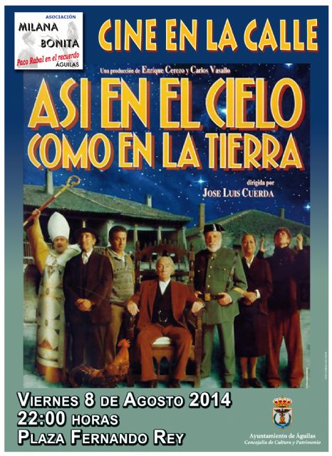 En su habitual actividad veraniega "Cine en la calle", la Asociacón Milana Bonita. Paco Rabal en el recuerdo proyecta "Así en el cielo como en la tierra", una sátira esperpéntica dirigida por José Luis Cuerda con un reparto coral en el que destacan Francisco Rabal, Fernando Fernán Gómez, Agustín González, Gabino Diego, Chus Lampreave y María Galiana entre otros.