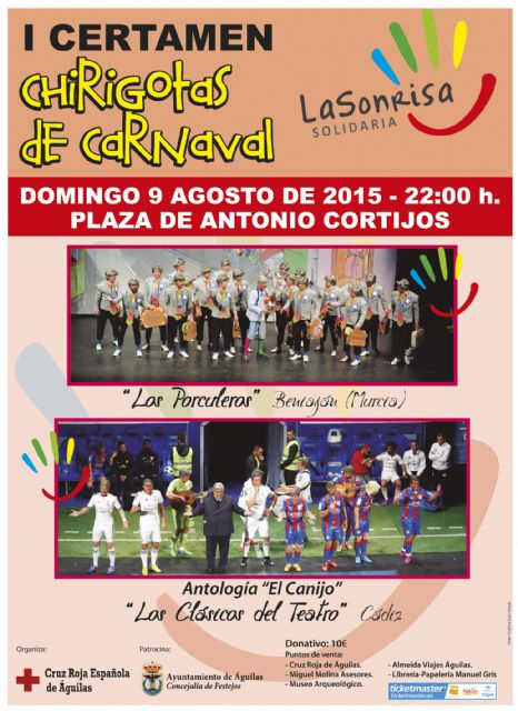 Cruz Roja Española en Águilas, con el Patrocinio de la Concejalía de Festejos del Ayuntamiento de la ciudad, el apoyo de la Federación de Peñas de Carnaval y de numerosas empresas de la Comarca del Bajo Guadalentín, ha organizado para el próximo 9 de agosto el I Certamen de Chirigotas de Carnaval.