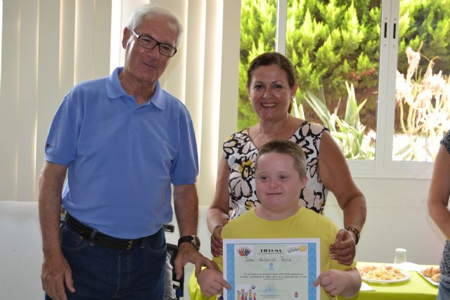 Los 21 niños que desde el pasado día 1 se han beneficiado del Programa Respiro Familiar, puesto en marcha por la Concejalía de Servicios Sociales del Ayuntamiento de Águilas, han recibido hoy, de manos del concejal de Educación, Vicente Ruiz, un diploma por su participación en el transcurso de una fiesta de fin de curso que ha tenido lugar en el Centro Ocupacional Urci.