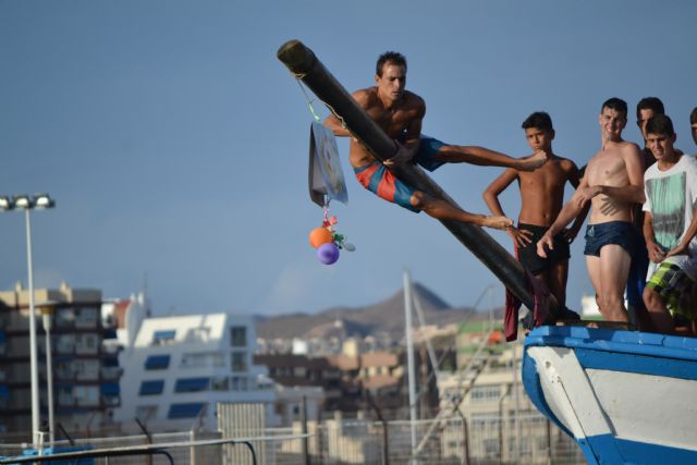 David García lograba, por décimo tercera vez, el triunfo en la cucaña; una prueba que este año presentaba, como principal novedad, la eliminación del pavo vivo que hasta la fecha se venía colocando en el extremo de la cucaña. El joven aguileño recibía un vale para ser canjeado por un pavo, una paella de arroz y pavo por gentileza de Huerto Don Jorge y un premio en metálico que García ha donado a la Asociación Protectora de Animales, gesto muy aplaudido por todos los asistentes al acto de entrega de premios. En la regata de botes a remo fue el Club de Remo Águilas el primero en cruzar la línea de meta, seguido por Danipan y la Cofradía de Pescadores de Torrevieja.
