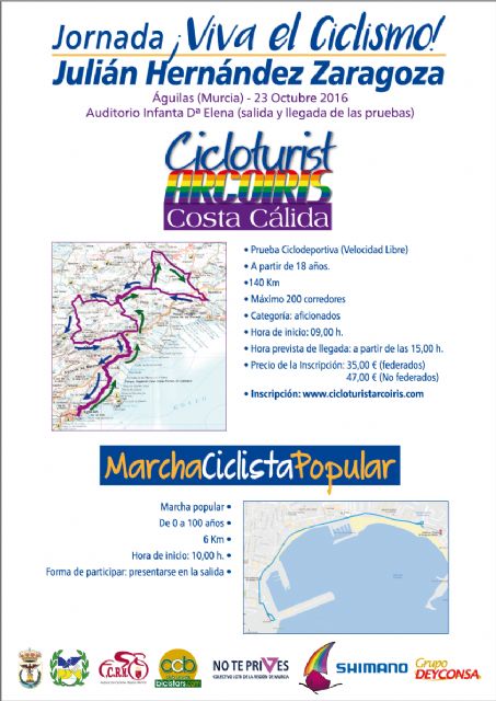El próximo domingo, 23 de octubre, se vivirá una jornada ciclista en recuerdo del ciclista aguileño Julián Hernández Zaragoza, fallecido en accidente de tráfico en el año 90. El evento, según han explicado en rueda de prensa el edil de Deportes, Cristóbal Casado, el responsable de comunicación de Cicloturistarcoiris, Santiago Fernández, y el ciclista profesional retirado Fernando Piñero, constará de dos partes diferenciadas. Por un lado, a las las nueve de la mañana hasta un límite de 200 ciclistas tomarán la salida en la prueba cicloturista (ciclodeportiva, de velocidad libre) para recorrer cerca de 140 km por los municipios de Águilas, Mazarrón y Lorca, con subidas al Lomo de Bas y Campico López. En la prueba se pueden inscribir todas las personas que lo deseen de más de 18 años con un precio de inscripción de 35,00 € los federados y 47,00 € los no federados, que incluye el seguro de un día. Las inscripciones se pueden realizar desde la página web www.cicloturistarcoiris.com o desde la plataforma de www.cronomur.es.