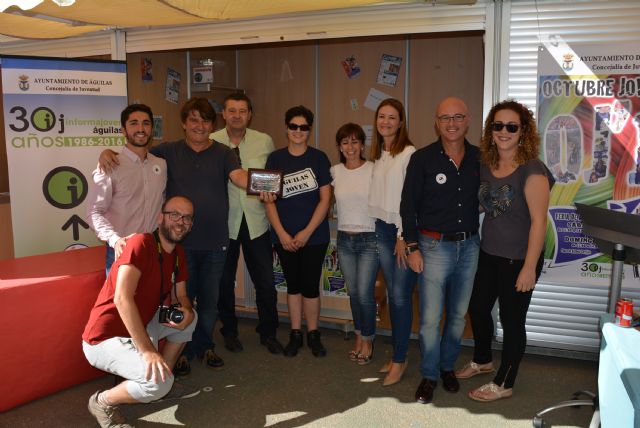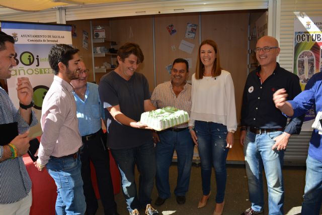 Aguilas vivió el fin de semana más joven y activo del año con la celebración de la Feria de Asociaciones, que marca el ecuador del amplio programa de actividades del Octubre Joven 2016. Además en esta ocasión, se celebró el XXX Aniversario del Informa Joven, congregando en la Plaza de Antonio Cortijos a todos los concejales de Juventud que han encabezado este servicio desde su creación en 1.986. Tomás Consentino López, José Lajarín Cano, Juan Giménez Sagredo, Francisco Montalbán Miras, Fernando Piñero Gallego, Clara Valverde Soto, María Noelia Gallardo García, Francisco Hernández Terrones, Juan José Asensio Alonso y el actual edil de Juventud Cristóbal Casado García, recibieron un reconocimiento por parte de los técnicos de Informa Joven por el impulso y apoyo a lo largo de estos treinta años. Como no podía ser de otro modo, la concejalía de Juventud quiso ensalzar la labor de los que son el alma de este servicio municipal, los técnicos de Informa Joven, quienes también recibieron una placa en homenaje a su labor. Todos juntos soplaron las velas de una tarta conmemorativa y cantaron "cumpleaños feliz".