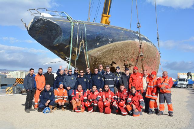 Tras catorce días hundido en el puerto pesquero de Águilas, el velero Penélope ya está en tierra firme. Ayer, tras un intenso operativo en el que participaron los buzos y técnicos de Salvamento Marítimo y los ingenieros de Puertos de la Consejería de Fomento, así como miembros de Cruz Roja y Protección Civil se lograba depositar el velero de 38 metros de eslora sobre una capa de geotextil y grava, ubicada en la explanada del muelle, en la que permanecerá unos cuarenta días, tiempo estimado para las labores de desguace.