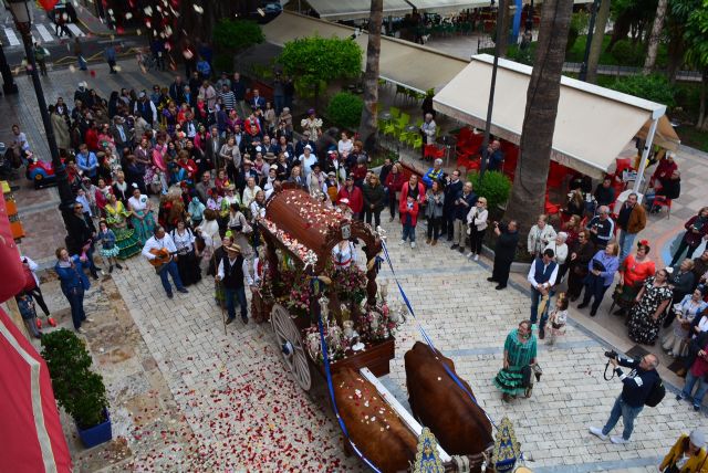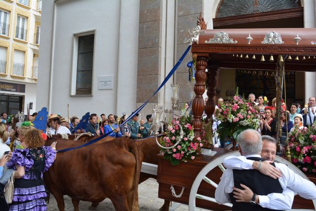 Un total de veinte carriolas, diez carros de caballos y más de cincuenta equinos han recorrido el camino realizando una primera parada en la puerta del Ayuntamiento donde la Blanca Paloma ha sido recibida con una lluvia de pétalos de flores. La carreta de la Virgen del Rocío, acompañada, entre otros, por la alcaldesa de Águilas, Mari Carmen Moreno, y el hermano mayor de la Hermandad aguileña, Fernando Gallego, continúa su camino hasta el cuartel de la Guardia Civil, punto en el que se ha realizado una ofrenda floral y el rezo del Ángelus.
