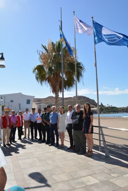 La alcaldesa de Águilas, Mari Carmen Moreno, y los ediles de Turismo y Medio Ambiente, Ginés Desiderio Navarro e Isabel Torrente, respectivamente, han asistido este fin de semana al izado de las banderas azules, Q de calidad y Ecoplayas conseguidas por el municipio de Águilas.