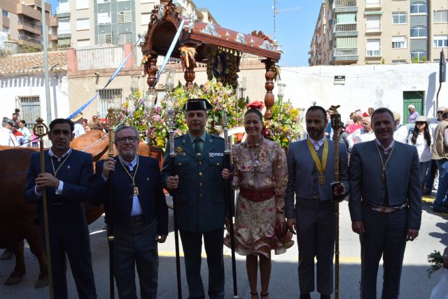 Como viene siendo habitual la primera parada de la carreta se produjo en la puerta del Ayuntamiento donde la Blanca Paloma fue recibida con una lluvia de pétalos de flores. Posteriormente la Virgen del Rocío, acompañada, entre otros, por la alcaldesa de Águilas, Mari Carmen Moreno, y el hermano mayor de la Hermandad aguileña, Fernando Gallego, continuaba su camino hasta el cuartel de la Guardia Civil, punto en el que se realizó una ofrenda floral y tuvo lugar el rezo del Ángelus. Un emotivo momento en el que además participaron los cuatro hermanos mayores que ha tenido la Hermandad en estos treinta años de historia.