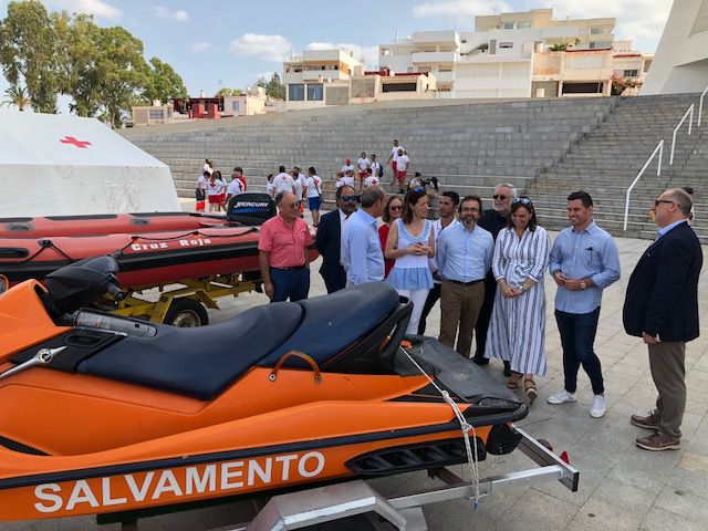 El consejero de Presidencia, Pedro Rivera, y la alcaldesa de Águilas, María del Carmen Moreno, presentaron hoy los efectivos que se despliegan en las playas de Águilas dentro del Plan COPLA, con 19 puestos, una silla de vigilancia, 37 socorristas, cuatro embarcaciones, cuatro kayaks y tres sillas para baño de personas con discapacidad.  Además, se dispone de la embarcación de salvamento ‘Titania’, anclada en el puerto pesquero, servida por un patrón y dos socorristas; y un vehículo todoterreno y dos socorristas para intervención en playas no vigiladas.