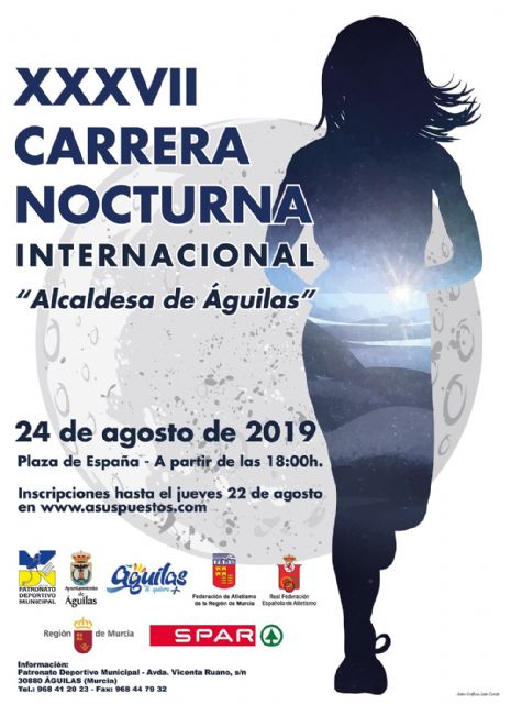 El mes de agosto volverá a ofrecer la oportunidad de disfrutar de una de las pruebas de mayor renombre a nivel nacional, un gran clásico de nuestra Región. Águilas se vestirá de gala el próximo sábado 24 para celebrar la XXXVII Carrera Nocturna Internacional "Alcaldesa de Águilas", bajo la organización del Patronato Deportivo Municipal de la ciudad aguileña y que un año más contará con atletas de nivel mundial. A partir de las 18:00h. se podrá disfrutar de las pruebas para las distintas categorías, poniendo el broche el Trofeo Alcaldesa de Águilas femenino, previsto a las 20:20h. sobre un recorrido de 5.000m., y finalmente el apartado masculino a las 21:00h. con una distancia de 10.000m.