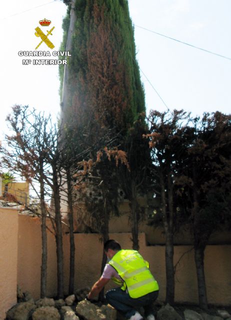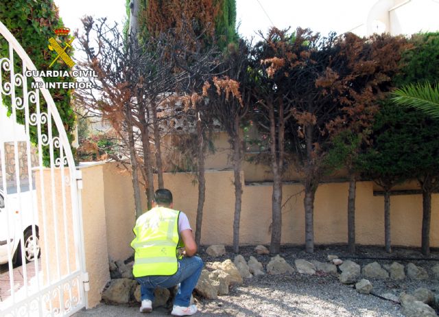 El primero de los hechos investigados tuvo lugar el pasado 09 de julio, cuando se originó un incendio de gran virulencia en los setos del jardín de una vivienda ubicada en una urbanización del municipio. El fuego afectó a de cinco metros de seto aproximadamente y a un ciprés de grandes dimensiones perteneciente a la vivienda contigua a donde se originaron las llamas.