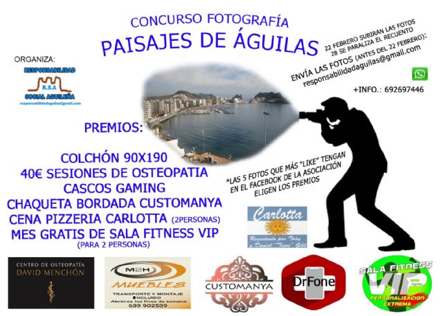 La entrega de premios tendrá una peculiaridad, ya que no habrá ganadores ni perdedores. Es decir, las 5 fotografías que más “me gusta” tengan en el Facebook de la Asociación (Responsabilidad Águilas) podrán elegir el que quieran en orden de los “me gusta” que logren.