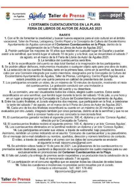 La concejalía de Cultura, en colaboración con Taller de Prensa, Letragency y Centro Papel han convocado el I Certamen de Cuentacuentos en la Playa, un evento que estará integrado en la programación de la II Feria de Libros de Autor de águilas, que se celebrará el próximo verano si la situación epidemiológica lo permite. El objetivo de este Certamen es fomentar la creatividad y buscar nuevos espacios para el ocio cultural en el ámbito vacacional.