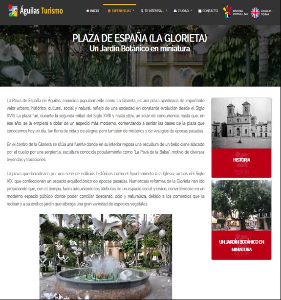 Conscientes del valor, tanto turístico, como ambiental, de los jardines de la Plaza de España, desde las concejalías de Educación Ambiental, Turismo y Desarrollo Económico han desarrollado un proyecto interactivo, alojado en la página web http://www.aguilas.es/un-jardin-en-miniatura.php, que recoge la historia de la Glorieta (como popularmente se conoce este entorno), al tiempo que, mediante un Plano Dinámico del Jardín, se pueden descubrir las especies más significativas y singulares, así como datos curiosos de las mismas. Del mismo modo, se han instalado en el jardín una mesa interpretativa y paneles identificadores de esas especies, pudiendo acceder, mediante un código QR a cada una de ellas. Así lo ha presentado esta mañana el concejal Ginés Desiderio Navarro, quien ha explicado el gran trabajo de investigación que hay tras este proyecto.