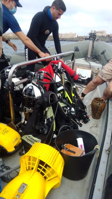 El Equipo Operativo de Buceo (EOB) del Centro de Buceo de la Armada (CBA), con sede en Cartagena, ha llevado a cabo durante esta semana labores arqueológicas a nivel subacuático en el litoral de Águilas, acompañados por el arqueólogo municipal, Juan de Dios Hernández. "No se trata de excavación, sino de protección, de localización y de prospección arqueológica. Por lo tanto, lo que hemos hecho ha sido elegir gran parte de la bahía del hornillo, la zona occidental, para hacer una prospección exhaustiva con sonar de barrido lateral donde se pueden observar si hay contactos en el fondo susceptibles de que pueda ser algún pecio o un resto arqueológico", ha explicado Juan de Dios Hernández, quien ha informado de que "con estas inmersiones hemos recuperado algún elemento suelto que podía correr peligro de expolio". Se trata de dos vasijas de principios del siglo XX relacionadas con los vapores ingleses que venían a la carga de mineral en el Embarcadero del Hornillo.