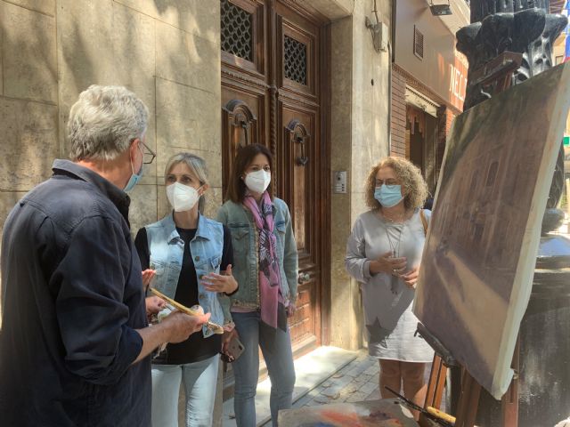 Esta mañana la alcaldesa y la edil de Cultura han visitado al pintor, con el que han charlado sobre la obra. "Invitamos a los ciudadanos de Águilas y visitantes a que se acerquen a la Plaza de España manteniendo las distancias y las medidas Covid para disfrutar del proceso creativo de la obra y contemplar este edificio que debe de ser conservado y protegido", han comentado desde la Asociación.