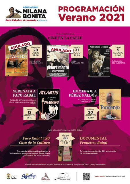 La programación estaba compuesta por la proyección de cuatro películas —“El consejero”, “Divertimento”, “El eclipse” y “Tormento”, esta última, con un año de retraso por los imperativos de la pandemia, en conmemoración de Pérez Galdós en el centenario de su fallecimiento—; la Serenata a Paco Rabal, este año a cargo del grupo Atlantics, rememorando la música de los sesenta y los setenta; y, finalmente, coincidiendo con el aniversario del fallecimiento del internacional actor, una conferencia y proyecciones videográficas, “Paco Rabal y su Casa de la Cultura”, a cargo de Miguel Ángel Blaya, presidente de Milana Bonita, y la proyección de un documental sobre el actor realizado por Carlos del Amor, de RTVE.