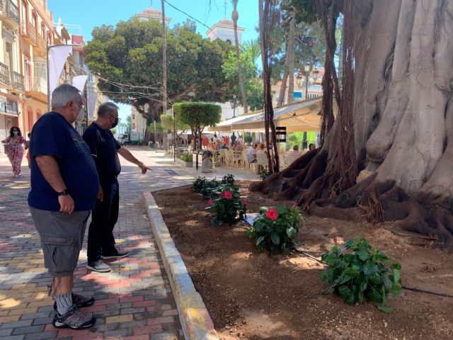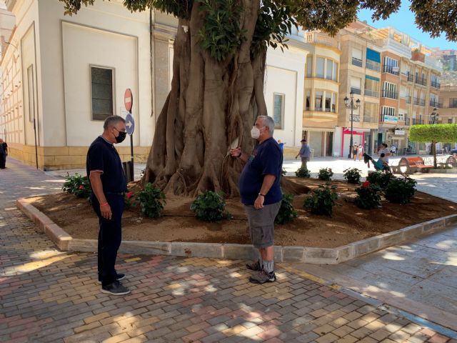 Los parterres de los Ficus de Plaza de España que convergen con las calles Conde de Aranda y Juan Pablo II se han ampliado dos metros perimetrales con el objetivo, según ha explicado el concejal de Parques y Jardines, Bartolomé Hernández, de "oxigenar la tierra y que las raíces aéreas de estos grandes árboles puedan aterrizar, dándoles mayor estabilidad. Los parterres se han rellenado con tierra de labor y en lugar de un vallado metálico, se ha optado por un vallado natural, para lo que se han plantado más de 60 Hibiscus para que formen seto". Los naranjos que había en el jardín lateral se han trasplantado en el Jardín de la Memoria Histórica.