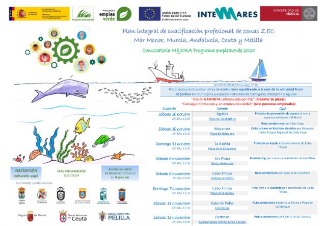 El próximo 30 de octubre Águilas acogerá una de las sesiones de la acción formativa "Propuesta práctica alternativa de ecoturismo equilibrado a través de la actividad físico deportiva en municipios y espacios naturales de Cartagena, Mazarrón y Águilas", integrada en el Plan Integral de Cualificación Profesional de Zonas ZEC del Mar Menor, Murcia, Andalucía, Ceuta y Melilla. Consistirá en una práctica de prevención de acceso al mar y espacios naturales del litoral y se realizará en la playa de Calabardina, de 9:30h a 13:30h. Se trata de un A esta acción se suman otras 17 acciones formativas, totalmente gratuitas, que serán llevadas a cabo a lo largo de 9 meses.