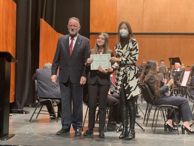 Como viene siendo habitual, durante esta cita con la música tuvo lugar la entrega de diplomas a los nuevos componentes de la banda; un reconocimiento que recibían de la mano de la alcaldesa los jóvenes Manuel Reverte Viudez y Celia Ramírez Jiménez. Del mismo modo, el Patronato rindió homenaje a los músicos Pedro Miras Hernández, José Antonio Mayor de Haro y Paqui Martínez López que este año celebran sus 25 años como componentes de la banda aguileña.