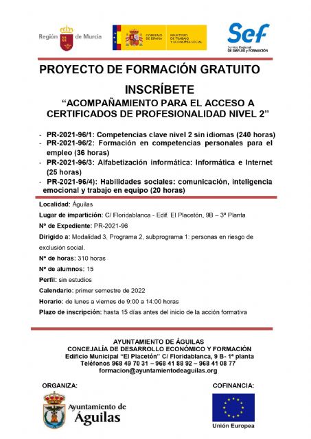 La principal ventaja de estos cursos es que se corresponden con certificados de profesionalidad que acreditan la cualificación profesional y abren la puerta a futuros empleos. El Ayuntamiento de Águilas busca con estas y otras acciones formativas seguir trabajando por la mejora de la cualificación profesional de los desempleados del municipio, fomentando así la creación de más empleo.