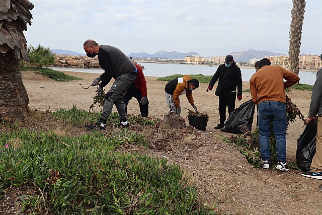 Esta mañana, con la participación de los usuarios de la Asociación Salud Mental Águilas (AFEMAC), ha comenzado la retirada de esta planta en la playa de la Colonia.