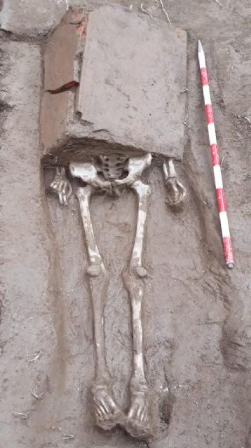 En concreto- proseguía diciendo el arqueólogo municipal- "se ha constatado un constatado un nivel de vertedero de época tardorromana (siglo V d.C.) en el sector noroccidental de la parcela. Se trata de un depósito que rellena una fosa excavada en el nivel de limos arenosos, posiblemente para la utilización de arcilla en labores de alfarería (apareció un horno cerca). Contiene abundante material cerámico de todo tipo (sigillatas africanas y paleocristianas, ánforas locales y de importación, cerámicas comunes y de mesa, etc.) con niveles cenicientos, restos óseos y malacológicos terrestres y, destacando, los grandes depósitos de restos ictiológicos relacionados con la elaboración de salazones y también abundantes restos de murícidos que indican que en las proximidades se producía púrpura. En segundo lugar, distribuidos por toda la parcela, a distintas cotas de profundidad y localizados en niveles de limos arenosos, se registran varios enterramientos de la necrópolis occidental o alto-imperial del enclave romano aguileño. En esta primera fase hemos localizado cinco enterramientos de inhumación dos de ellos infantiles. La presencia de ajuares cerámicos está permitiendo poder fechar con precisión este sector del cementerio. En una tumba doble aparece un plato de sigillata africana que se fecha en la 2ª mitad del s. II d.C. Otras piezas, como una jarra de cerámica común, pueden datarse en el s. III d.C. Por tanto, estamos en el sector más occidental de esta necrópolis que pensamos va asociada a una vía de salida de la ciudad romana (calle Rey Carlos III Carretera de Vera, antigua Cañada Real) y que por el momento se extiende linealmente sobre este eje más de 150 m, lo que indica su gran magnitud".