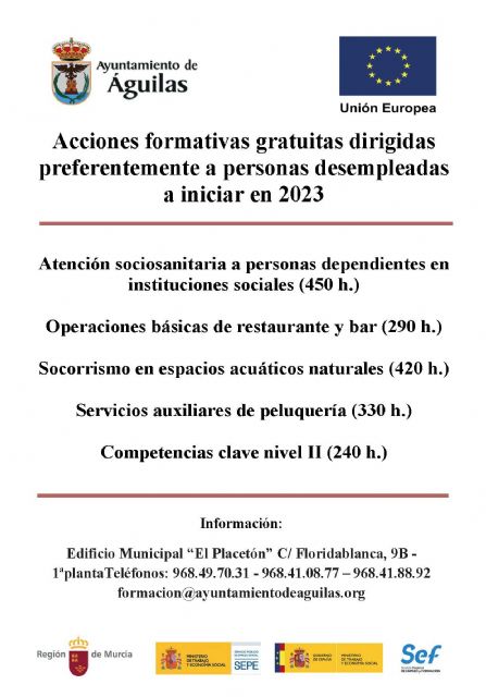 Estas acciones formativas, organizadas por el Ayuntamiento de Águilas debido a su gran demanda, van dirigidas principalmente a personas desempleadas y se financian con cargo al presupuesto de gasto del Servicio Regional de Empleo y Formación de la Región de Murcia para el ejercicio 2022, con fondos procedentes del Servicio Público de Empleo Estatal (SEPE) y del Ministerio de Educación y Formación Profesional (MEFP).