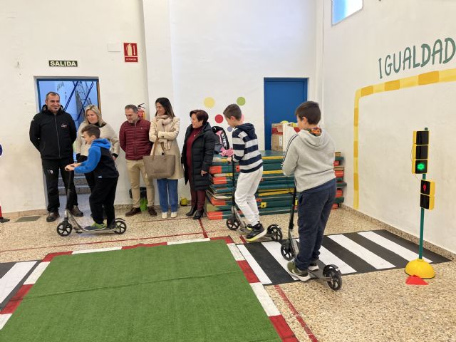 La alcaldesa de Águilas, Mari Carmen Moreno, acompañada por la edil de Educación, Francis Gallego, y por uno de los representantes de Lázarus Vital, han visitado hoy el CEIP Mediterráneo, en el que los alumnos de Primaria estaban recibiendo una de las sesiones prácticas que se incluyen dentro del Proyecto Educación Vial.