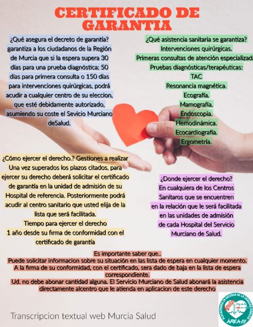 -La puesta en marcha de un Despacho en la Casa de Cultura Francisco Rabal, donde atenderemos a los ciudadanos que así lo deseen los martes de 11:00 a 13:00 h y los jueves de 19.00 a 21:00, será un punto de Información y Asesoramiento para las Reclamaciones del ÁREA III. Todo aquel paciente que tenga alguna duda sobre los tiempos de espera tanto de especialistas, como de intervenciones etc. Se le asesorará y se pondrá a su disposición las herramientas para reclamar si no es atendido dentro de los plazos legales haciendo uso del Certificado de Garantía, que es un gran desconocido para los pacientes, ya que muchos de ellos no saben que estamos amparados por un ley que limita los tiempos de espera.
