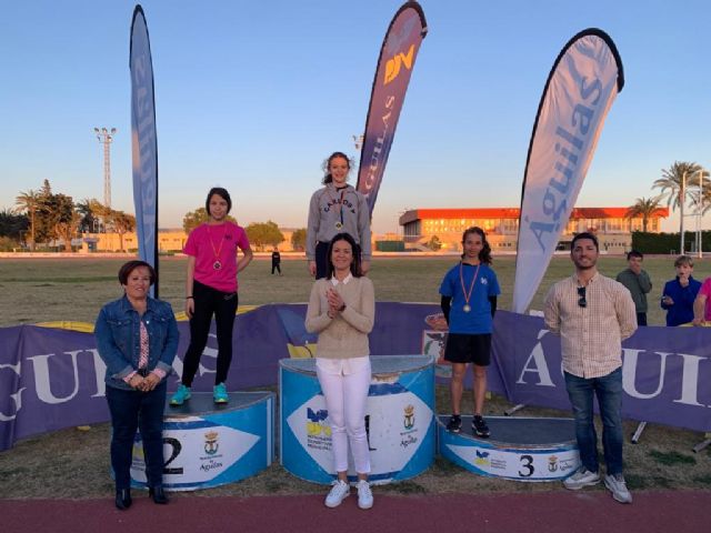 Los escolares aguileños, procedentes de todos los colegios de la localidad, competieron en las diferentes modalidades: 60 metros lisos, 500 metros lisos, salto de longitud, lanzamiento de peso y relevos.