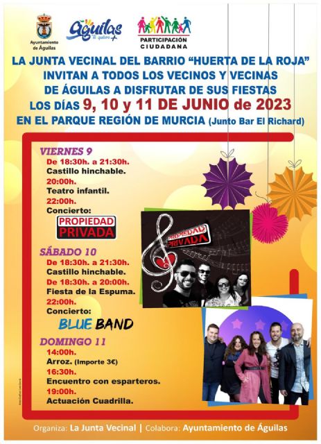 La Junta Municipal del barrio "Huerta de la Roja", en colaboración con la Concejalía de Participación Ciudadana, ha programado para este fin de semana una verbena que se desarrollará en la Plaza de la Región de Murcia con motivo de la festividad del Día de la Región.