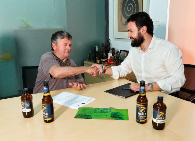 La firma del convenio ha tenido lugar esta mañana entre el presidente de la Fundación del Cante de las Minas, Joaquín Zapata, y el propietario de la empresa distribuidora en la zona, José Ayala Martínez, con la presencia además del director del Festival, Julio García, y el gestor comercial de El Águila, Juan Carlos Celdrán.