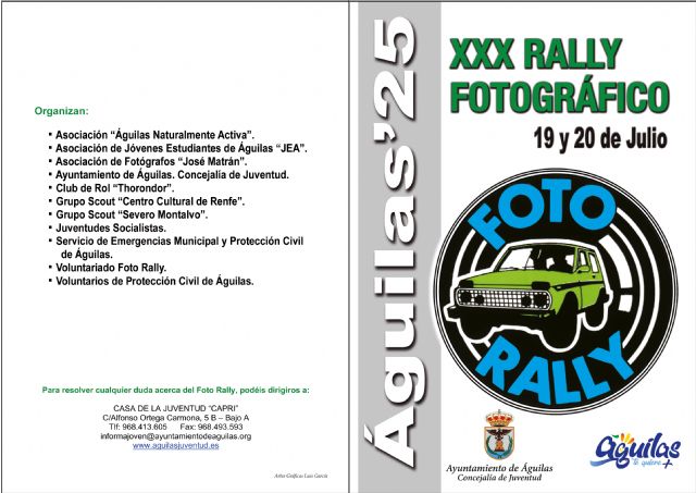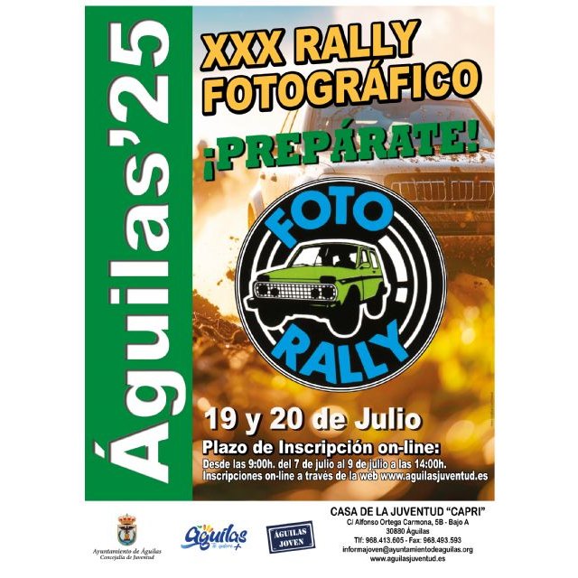 La Concejalía de Juventud del Ayuntamiento de Águilas, junto a diversas asociaciones como "Águilas Naturalmente Activa" y la Asociación de Fotógrafos "José Matrán", anuncian la celebración del XXX Rally Fotográfico, una emocionante prueba que combina la pasión por la fotografía, la habilidad en la orientación y el dominio de la conducción. El evento tendrá lugar el fin de semana del 19 y 20 de julio.