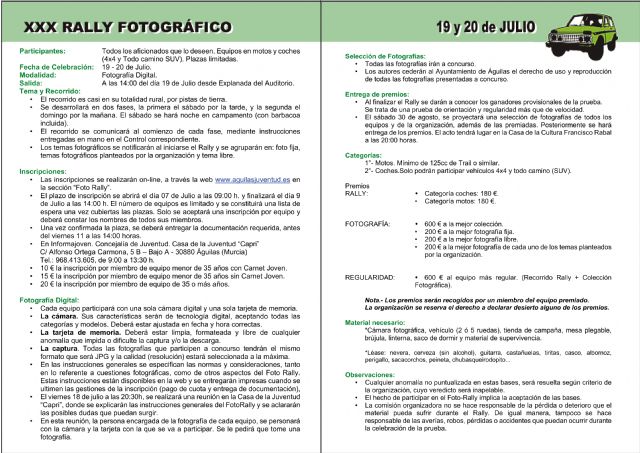 Además, el conjunto de las fotografías deberá reflejar el ambiente propio del rally, cubriendo desde la foto de control inicial hasta la meta. Se realizará una reunión informativa el viernes 18 de julio a las 20:30 en la Casa de la Juventud “Capri” donde se explicarán las instrucciones generales y se tomará una fotografía de "control" obligatoria. La tarjeta de memoria será recogida por la organización el 20 de julio al finalizar la prueba, con un máximo de 36 fotos más la foto de control.