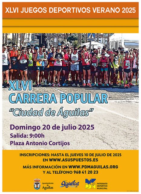 El Patronato Deportivo Municipal del municipio organiza la XLVI Carrera Popular “Ciudad de Águilas”, con salida a las 9:00h. desde la Plaza Antonio Cortijos