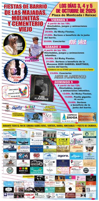 Los próximos 3, 4 y 5 de octubre la Junta Vecinal de Las Majadas, Molinetas y Cementerio Viejo, en colaboración con la concejalía de Participación Ciudadana del Ayuntamiento de Águilas, ha organizado sus fiestas de barrio, que se celebrarán en la Plaza Montcada i Reixac. El programa de actos, de carácter gratuito, será el siguiente: