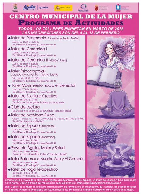 La edil de Igualdad del Ayuntamiento de Águilas, Elena Casado, ha dado a conocer las actividades que desde su área se han programado para este trimestre. Se trata- han indicado desde el Centro de la Mujer- de un programa variado en el que se incluyen actividades de todo tipo, consensuadas con los distintos colectivos de mujeres de la localidad, con las que se pretende ofrecer un extenso abanico de acciones lúdicas y formativas, todas ellas gratuitas.