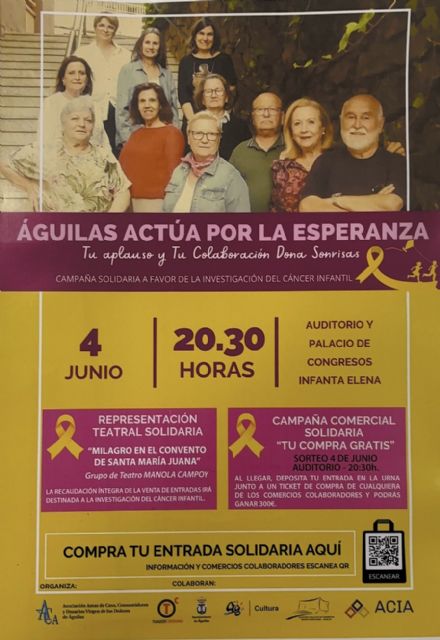 Las entradas podrán adquirirse en los establecimientos adheridos a la Asociación de Comerciantes e Industriales de Águilas (ACIA), entidad colaboradora que, además, ha impulsado la campaña solidaria "Tu compra gratis". Gracias a esta iniciativa, todos los asistentes a la representación participarán en el sorteo de un bono de 300 euros para consumir en el comercio local, incentivando así también la economía del municipio.